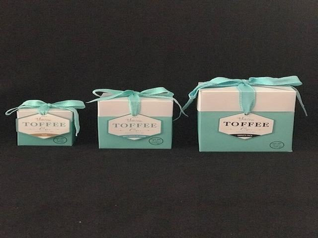 Our toffee comes beautifully packaged in unique, one-piece turquoise boxes – tied with matching grosgrain ribbon. What a perfect gift - or maybe just a delightful self- indulgence.